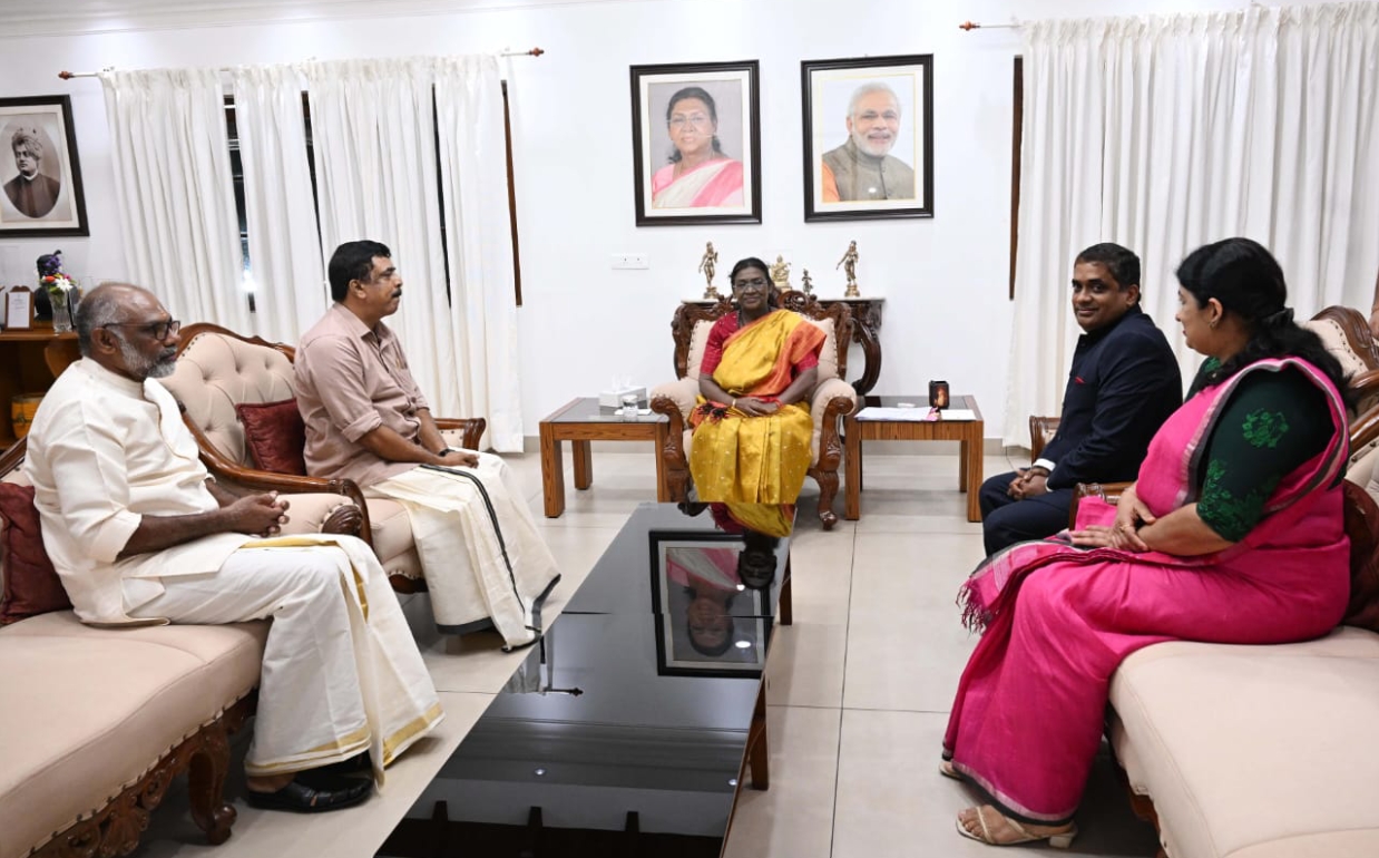 News Desk22-Oct-2025മുൻ രാഷ്ട്രപതി ഡോ. കെ ആർ നാരായണൻ ചരിത്രപുരുഷൻ: രാഷ്ട്രപതി - ഫൗണ്ടേഷൻ ചെയർമാൻ എബി ജെ ജോസ്, വൈസ് ചെയർമാൻ ഡോ സിന്ധുമോൾ ജേക്കബ്, സെക്രട്ടറി ആർ അജിരാജ കുമാർ, ലീഗൽ സെൽ അധ്യക്ഷൻ അഡ്വ ജെ ആർ പത്മകുമാർ എന്നിവരാണ് രാഷ്ട്രപതിയുമായി കൂടിക്കാഴ്ച നടത്തിയത്
