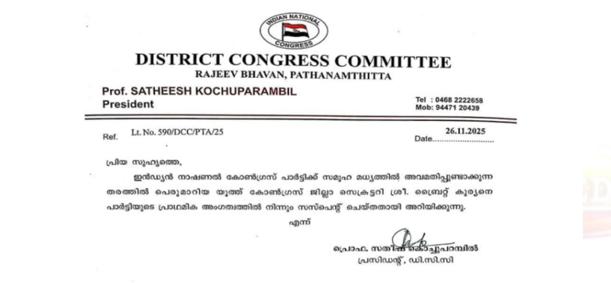 കുമ്പനാട് പെന്തക്കോസ്ത് സഭ ആസ്ഥാനത്തെ ആക്രമണം ; യൂത്ത് കോൺഗ്രസ് നേതാവിന് സസ്പെൻഷൻ - ആസ്ഥാനത്ത് ആക്രമണം കാട്ടിയതിനാണ് നടപടി. ഐ പി സി യുടെ തിരുവല്ല കുമ്പനാട് സഭാ ഹെഡ് ഓഫീസിലാണ് അക്രമം കാട്ടിയത്. യൂത്ത് കോൺഗ്രസ് ജില്ലാ ജനറൽ സെക്രട്ടറി ബ്രൈറ്റ് കുര്യനെയാണ് പാർട്ടിയിൽ നിന്ന് സസ്പെൻഡ് ചെയ്തത്. ഡിസിസി പ്രസിഡന്റ് സതീഷ് കൊച്ചുപറമ്പിലാണ് നടപടി എടുത്തത്.