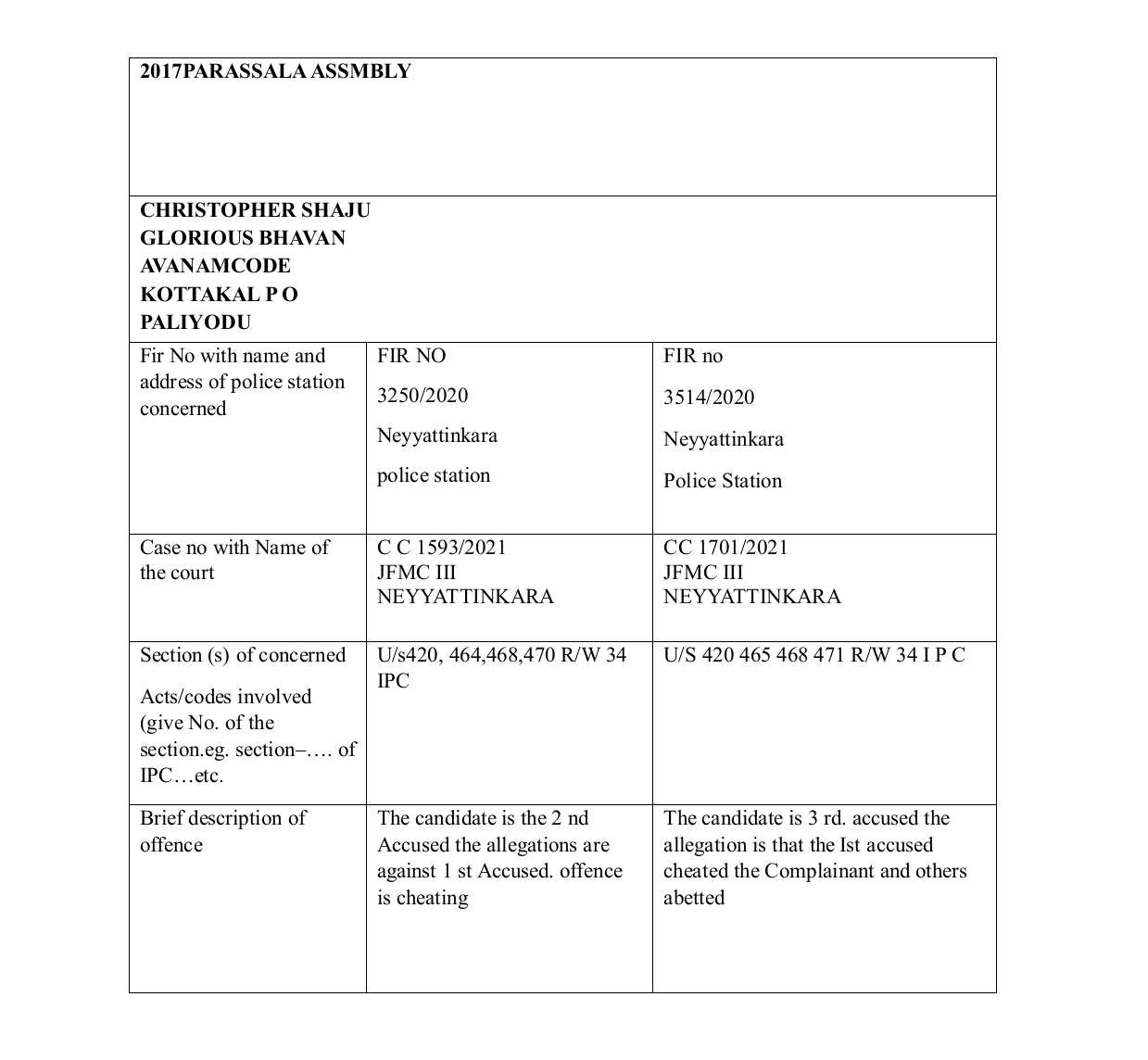 ക്രിസ്റ്റഫർ ഷാജുവിൻ്റെ കേസിനാധാരമായ റിപ്പോർട്ട് - ഷാജു പലിയോട് എന്ന പേരിൽ നിയമസഭാ ഇലക്ഷനിൽ മത്സരിക്കുന്ന സ്ഥാനർത്ഥിക്ക് എതിരെ ഗവൺ മെൻ്റ് രേഖയിൽ കാണപ്പെടുന്ന ചില കേസിൻ്റെ വിശദാoശങ്ങൾ ഇന്ത്യൻ നിയമത്തിൻ്റെ ഭാഗമായി പൊതു ജനങ്ങളുടെ അറിവിലേക്ക്