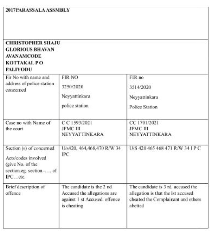 ക്രിസ്റ്റഫർ ഷാജുവിൻ്റെ കേസിനാധാരമായ റിപ്പോർട്ട് - ക്രിസ്റ്റഫർ ഷാജു എന്ന പേരിൽ പാറശ്ശാല നിയോജക മണ്ഡലത്തിൽ നിന്നും നിയമസഭാ ഇലക്ഷനിൽ മത്സരിക്കുന്ന സ്ഥാനർത്ഥിക്ക് എതിരെ ഗവൺ മെൻ്റ് രേഖയിൽ കാണപ്പെടുന്ന ചില കേസിൻ്റെ വിശദാoശങ്ങൾ ഇന്ത്യൻ നിയമത്തിൻ്റെ ഭാഗമായി പൊതു ജനങ്ങളുടെ അറിവിലേക്ക് പ്രസിദ്ധപ്പെടുത്തുന്നു.